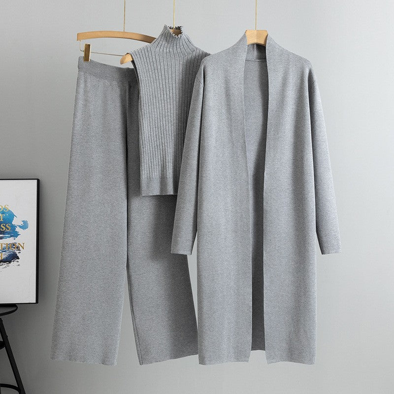 - Elegant three-piece set including cardigan, vest, and wide-leg pants